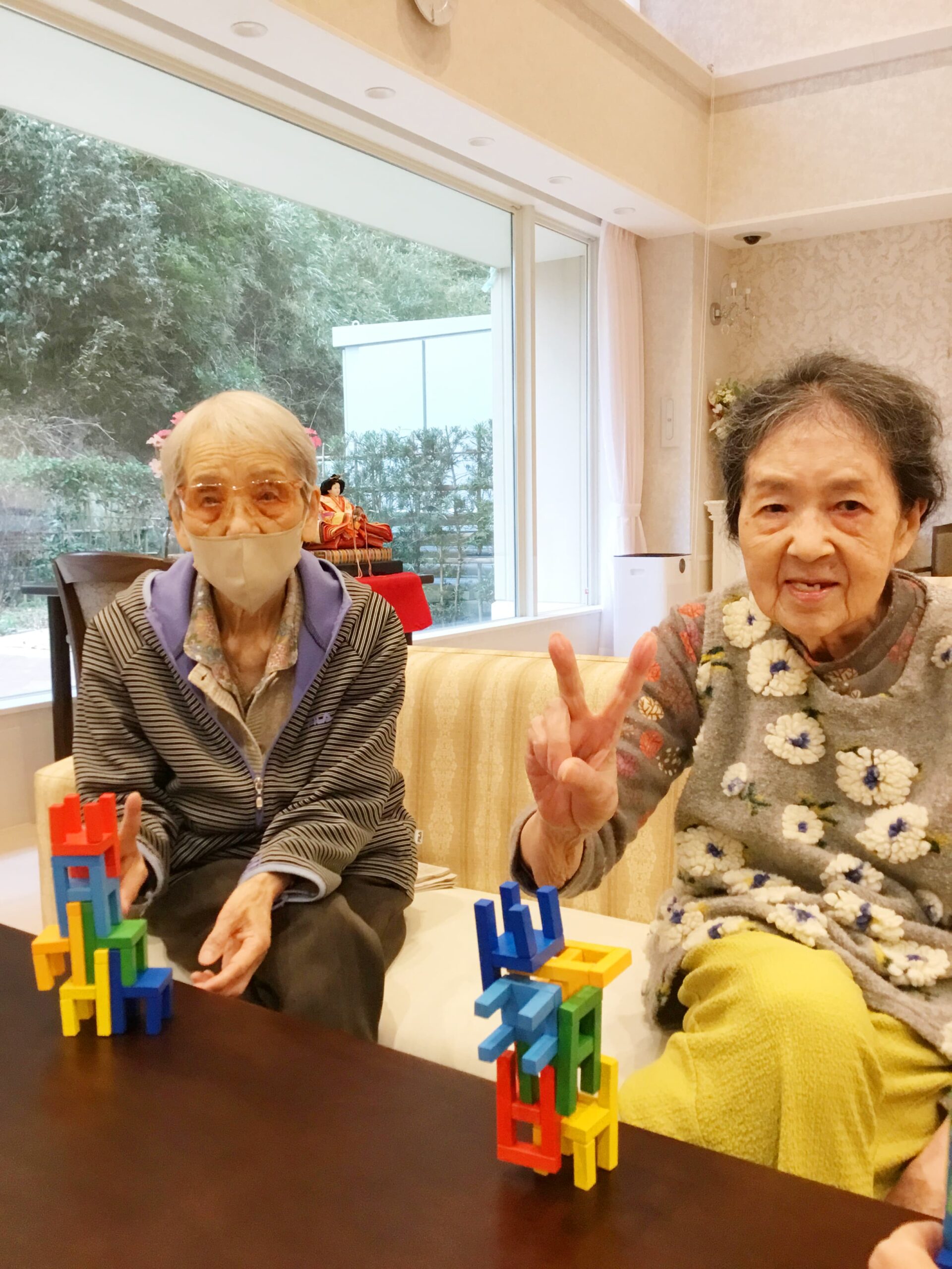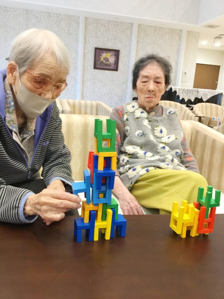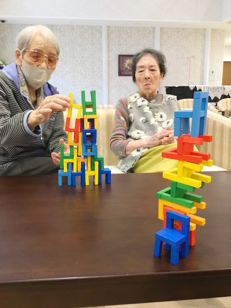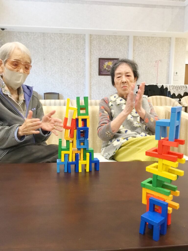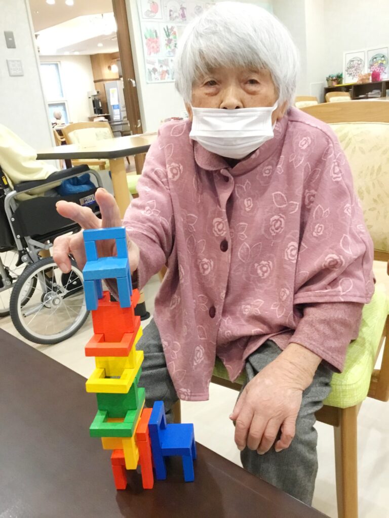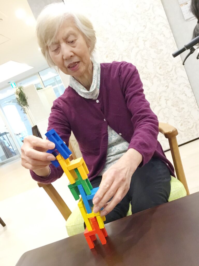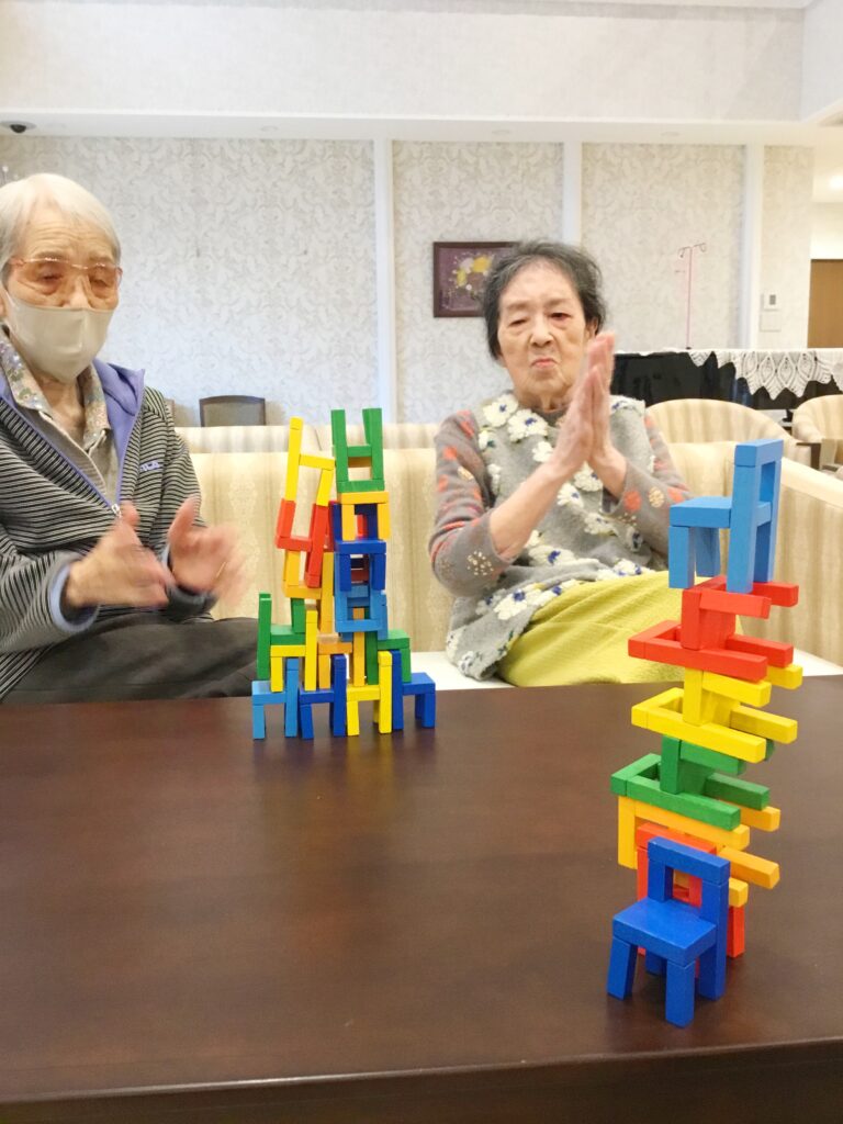 上手く積みあがった様子を見ているご利用者様、思わず拍手をしてしまいます。